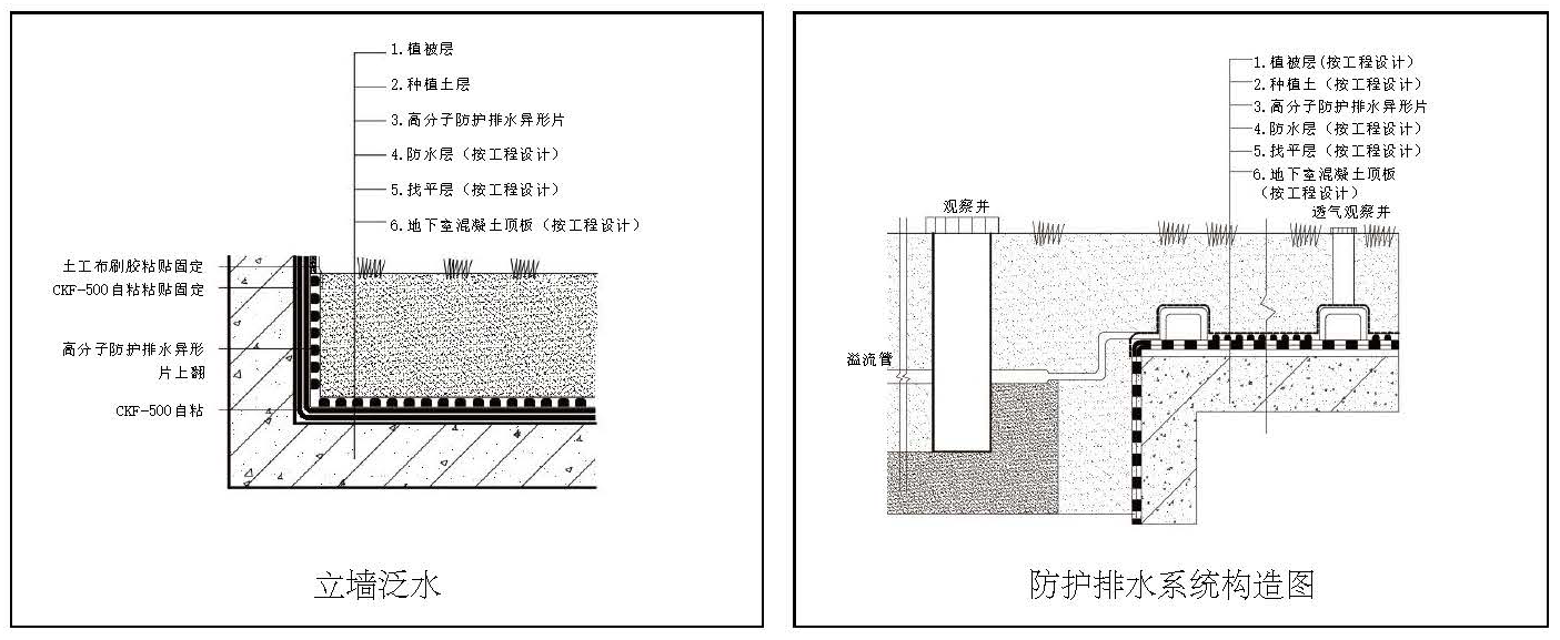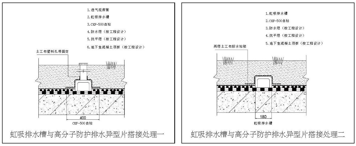 2、鋪設復合高分子異型片,拼接部位采用CKF500自粘卷材粘接,復合層無紡布采用粘接劑粘接固定。