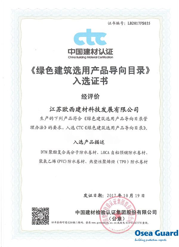 近日,歐西家建科四款產(chǎn)品“DTM聚酯復(fù)合防水卷材”、“LOCA自粘預(yù)鋪防水卷材”、“聚氯乙烯(PVC)防水卷材”、“熱塑性聚烯烴(TPO)防水卷材”獲得國家建筑材料測試中心頒發(fā)的《綠色建筑選用產(chǎn)品證明商標(biāo)準(zhǔn)用證》,并經(jīng)中國建材檢驗認(rèn)證集團(tuán)評價成功入選《綠色建筑選用產(chǎn)品導(dǎo)向目錄》。