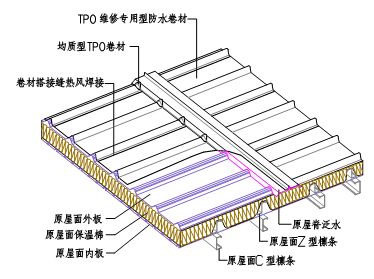 TPO防水卷材在金屬屋面維修工程的應用 針對目前瀝青類卷材以及防水涂料在壓型金屬屋面維修的現(xiàn)狀,東方雨虹研發(fā)了金屬屋面維修專用型TPO防水卷材。維修專用型TPO防水卷材采用更加柔軟的材料配方體系,使之能貼合壓型鋼板的波形進行粘結,屋面采用整體維修的方式,從根本上解決金屬屋面滲漏的問題。