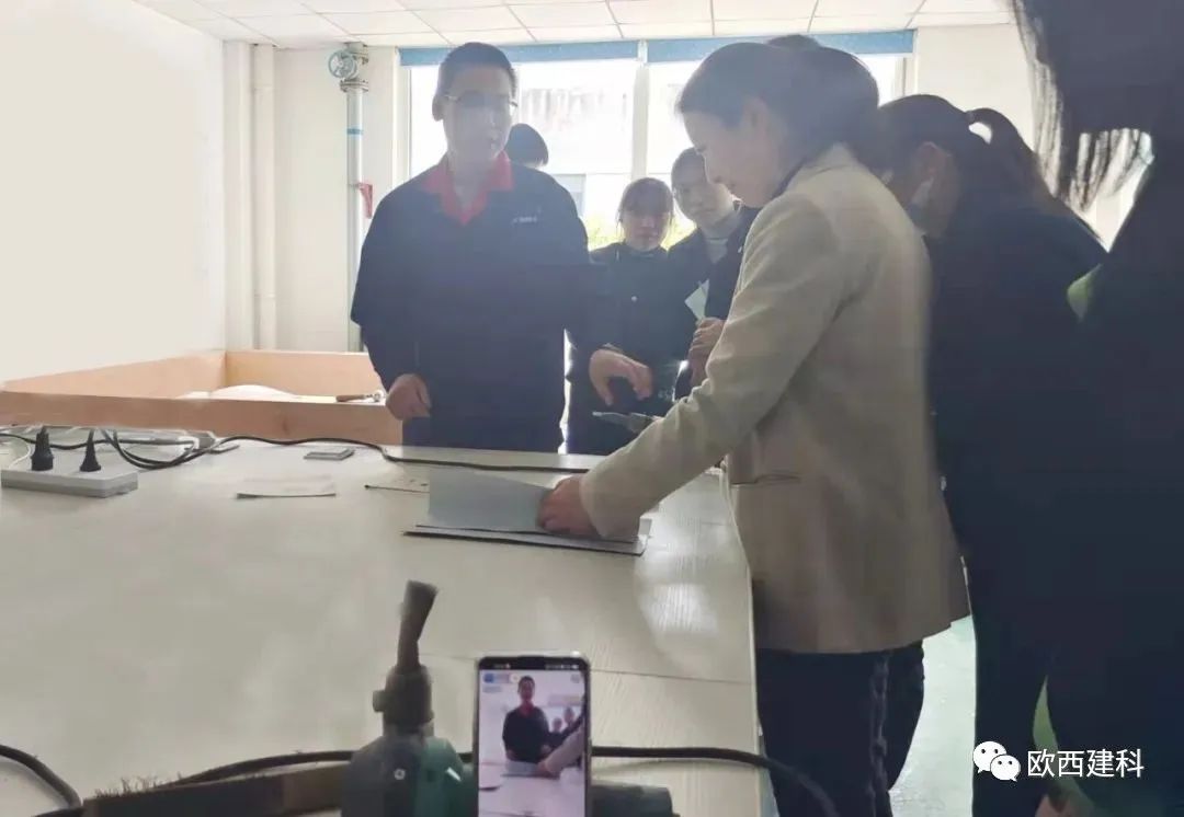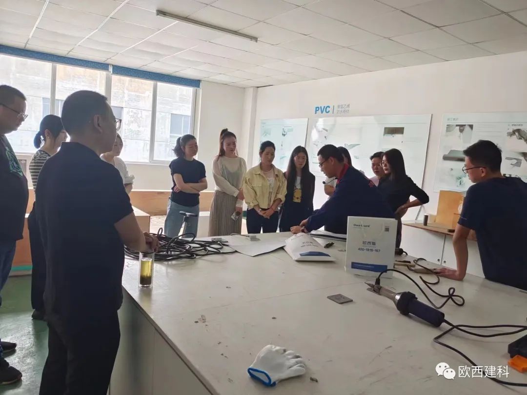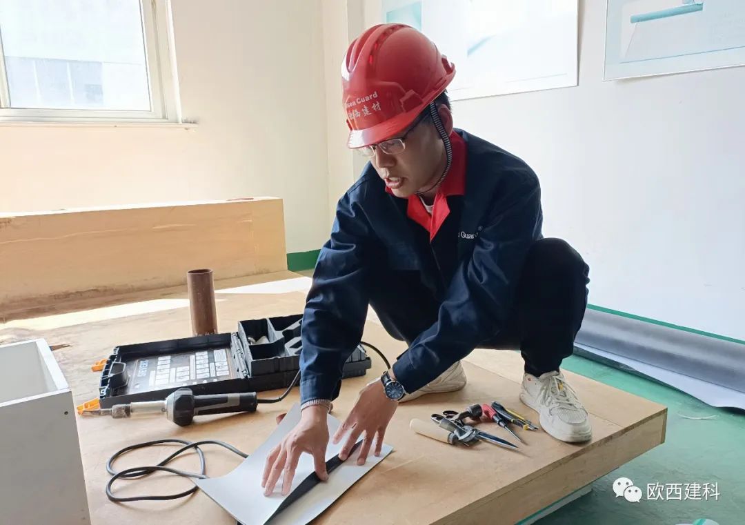 于經(jīng)理采取理論貫穿實操的教授方法,對歐西盾TPO防水卷材、LOCA預(yù)鋪反粘防水卷材作業(yè)標準化作業(yè)、安全標準化、質(zhì)量標準化等內(nèi)容進行了系統(tǒng)講解,現(xiàn)場模擬實操正確流程及安全注意事項,并結(jié)合實操演練對施工注意事項、焊槍及爬行焊機使用規(guī)范等內(nèi)容展開了培訓(xùn)等營銷人員通過接受專業(yè)實操訓(xùn)練,使大家更加直觀的感受到防水卷材在施工中的一些細節(jié),如陰陽角、管道、通風(fēng)口及樁頭的做法,有效提高了大家的防水專業(yè)技能知知識。