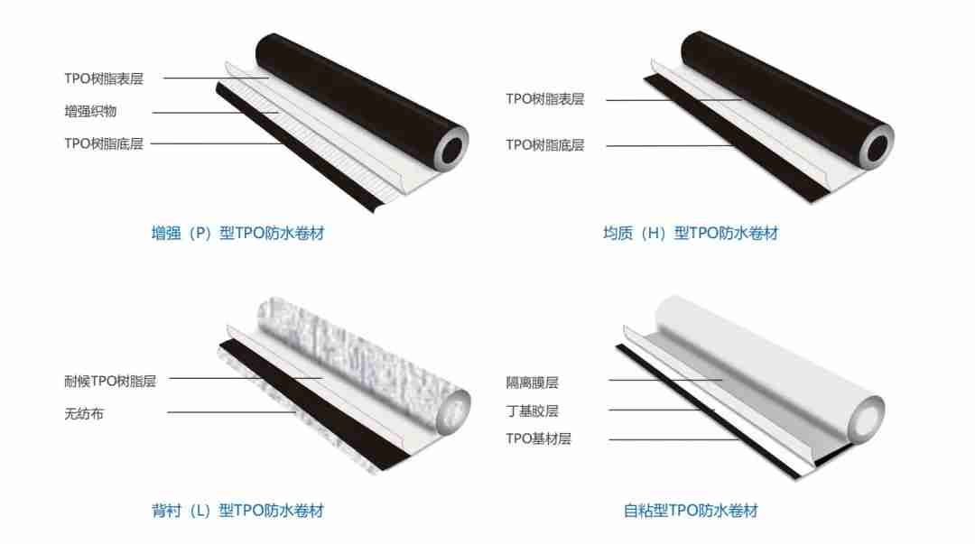 熱塑性聚烯烴(TPO)防水卷材是采用特殊的共混技術(shù)將乙丙橡膠與聚丙烯聚合在一起,添加抗氧劑、光穩(wěn)定劑、高效阻燃劑等助劑,通過擠出工藝制成的新型防水卷材。卷材不含有毒有害物質(zhì),屬于綠色環(huán)保的防水卷材。