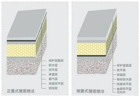 倒置式屋面與傳統(tǒng)保溫屋面構(gòu)造比較。